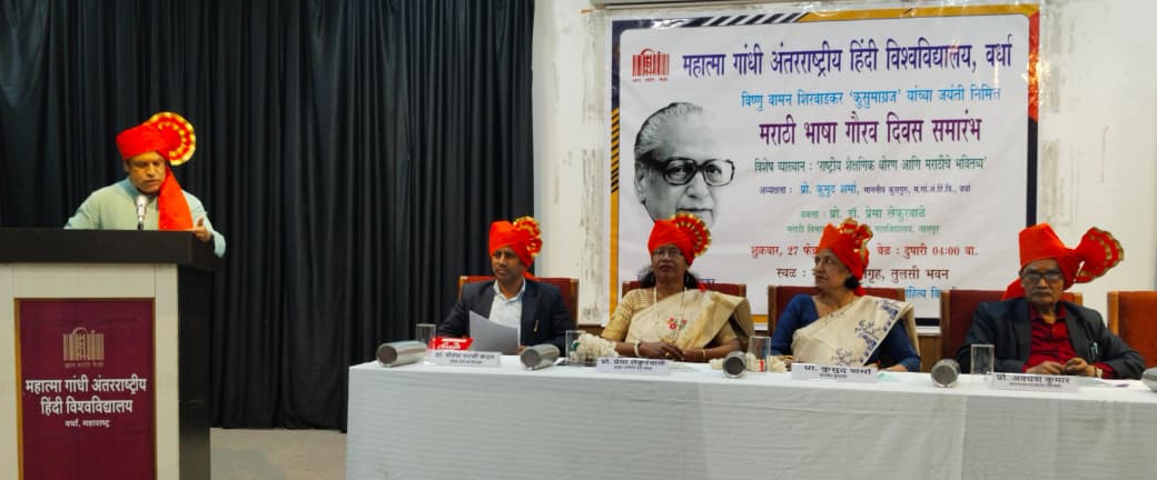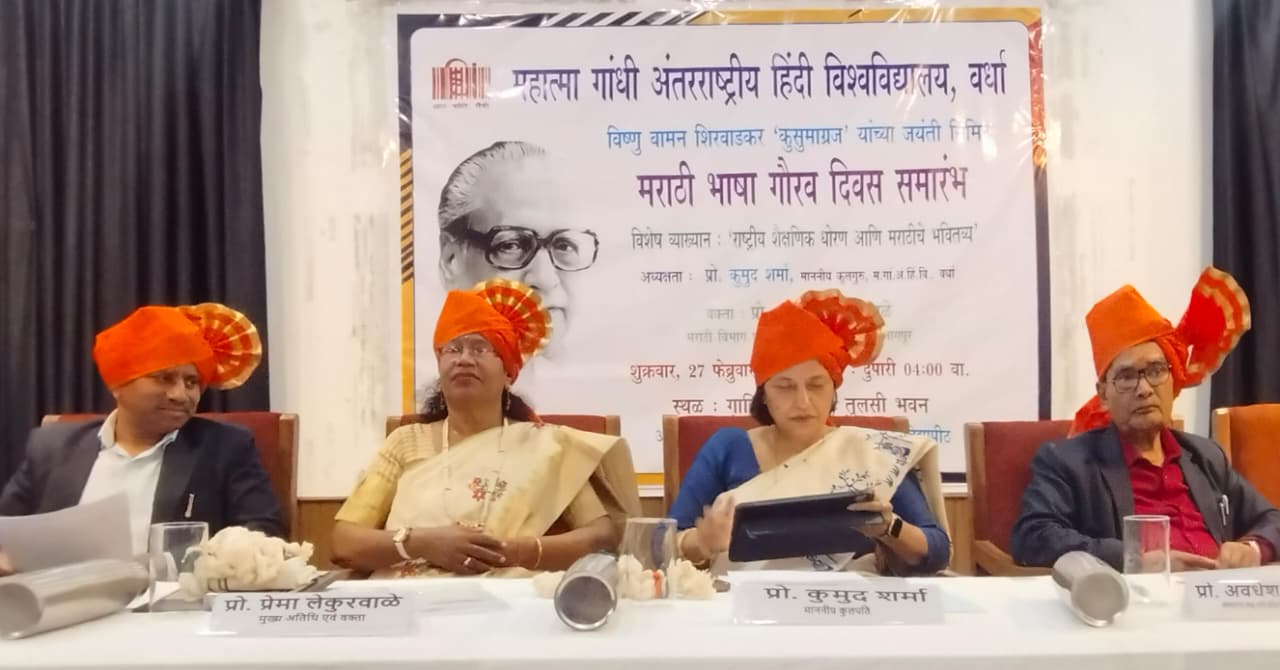 वर्धा, 26 फरवरी 2026: महात्मा गांधी अंतरराष्ट्रीय हिंदी विश्वविद्यालय में शुक्रवार 27 फरवरी को मराठी भाषा गौरव दिवस समारोह का आयोजन अपराह्न 4 बजे ग़ालिब सभागार में आयोजित किया जाएगा। मराठी साहित्य विभाग की ओर से आयोजित कार्यक्रम में राष्ट्रसंत तुकड़ोज़ी महाराज नागपुर विद्यापीठ के अंतर्गत रेणुका महाविद्यालय के मराठी विभाग की प्रो. डॉ. प्रेमा लेकुरवाळे का 'राष्ट्रीय शिक्षा नीति और मराठी का भविष्य विषय पर विशेष व्याख्यान होगा। कार्यक्रम की अध्यक्षता कुलपति प्रो. कुमुद शर्मा करेंगी। स्वागत भाषण साहित्य विद्यापीठ के अधिष्ठाता प्रो. अवधेश कुमार देंगे। कार्यक्रम के संयोजक साहित्य विद्यापीठ के अंतर्गत मराठी साहित्य विभाग के सहायक प्रोफेसर डॉ. संदीप सपकाले एवं सहायक प्रोफेसर डॉ. शैलेश कदम होंगे। इस अवसर पर उपस्थित रहने की अपील विश्वविद्यालय की ओर से की गई है।